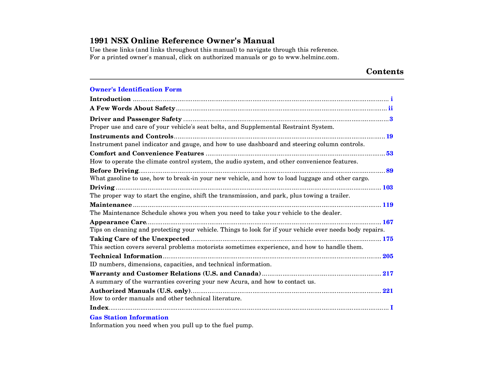 The 1991 ACURA NSX owner’s manual contains information on the operation and location of controls, a maintenance schedule and