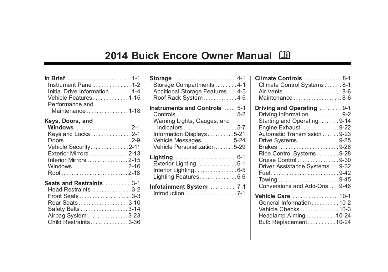 The 2014 BUICK Encore owner’s manual contains information on the operation and location of controls, a maintenance schedule and