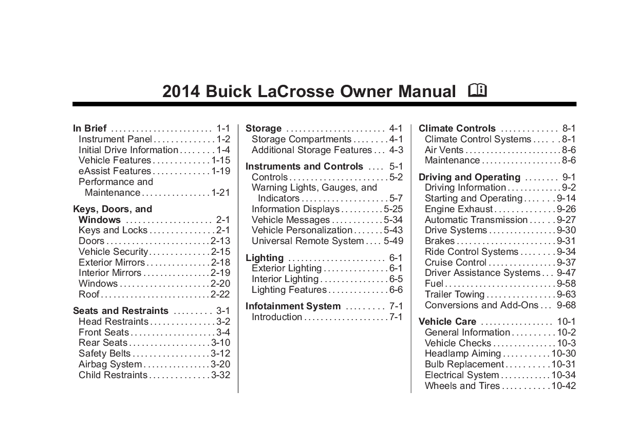The 2014 BUICK LaCrosse owner’s manual contains information on the operation and location of controls, a maintenance schedule and