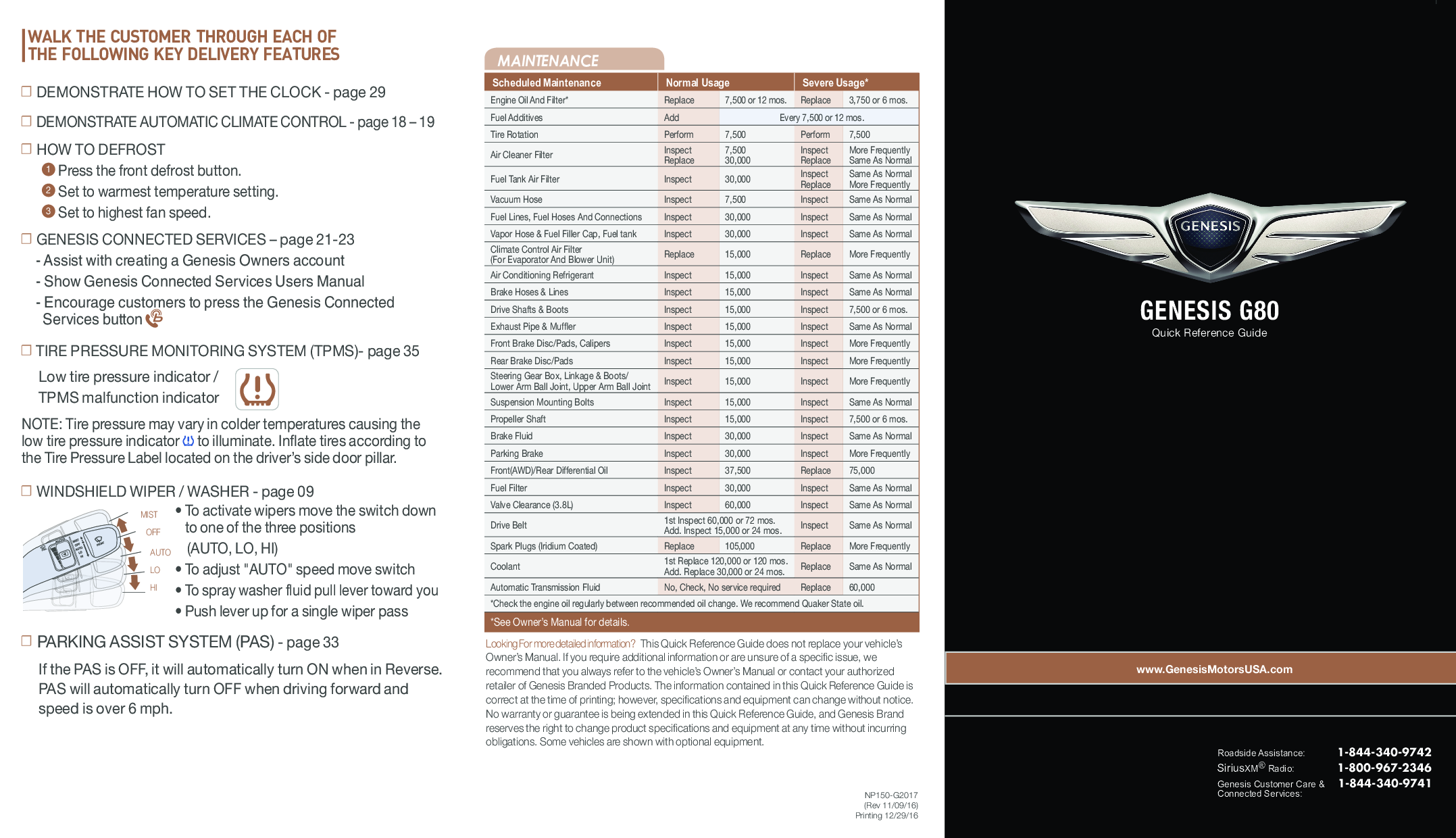 The 2017 GENESIS G80 Qsg owner’s manual contains information on the operation and location of controls, a maintenance schedule