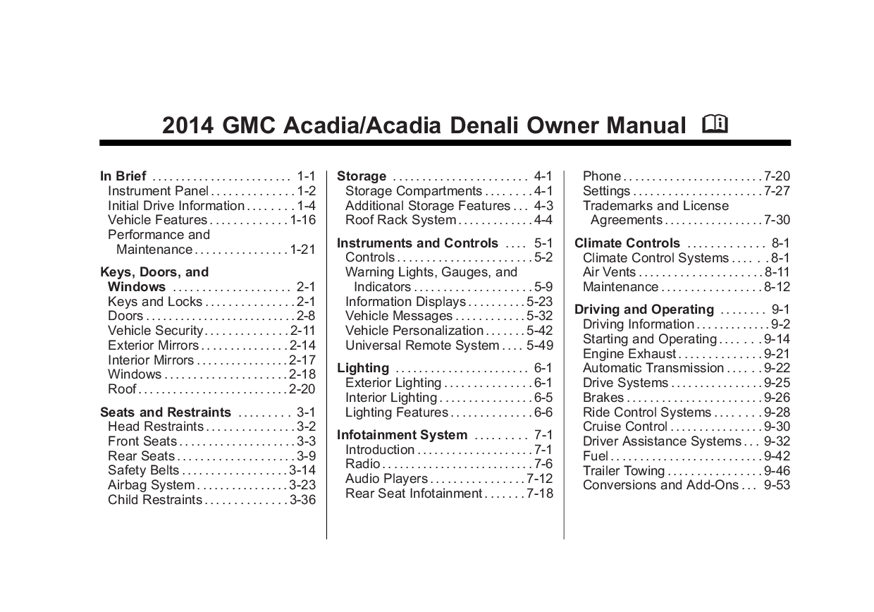 The 2014 GMC Acadia owner’s manual contains information on the operation and location of controls, a maintenance schedule and