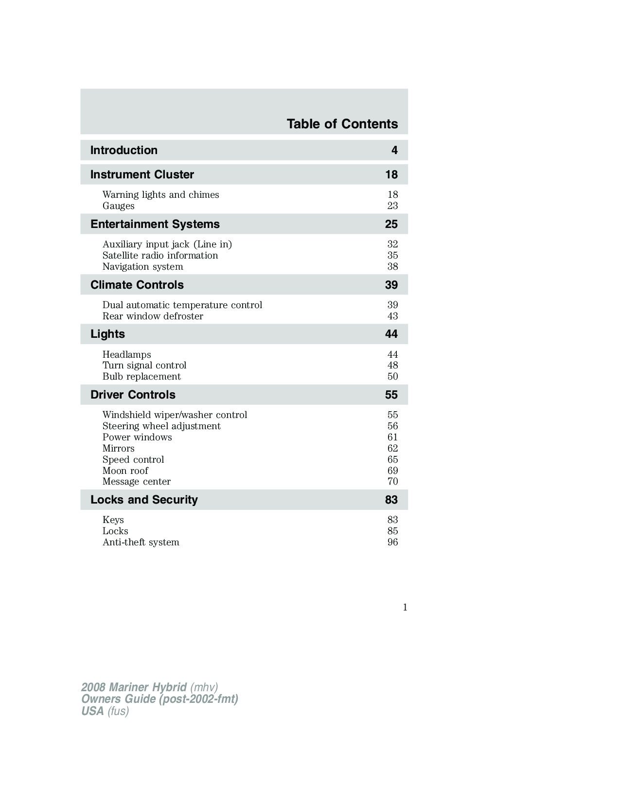 The 2008 MERCURY Mariner Hybrid owner’s manual contains information on the operation and location of controls, a maintenance