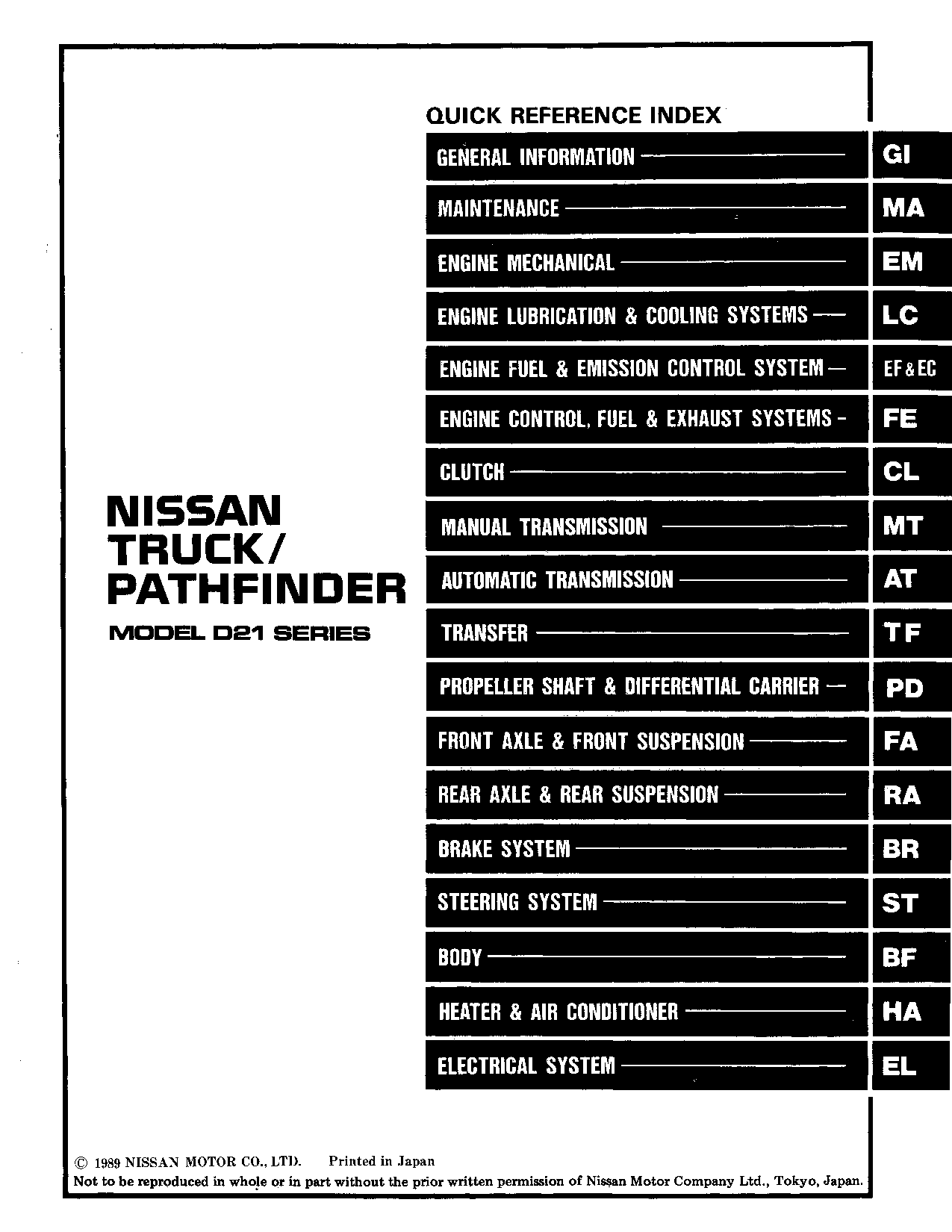 The 1989 NISSAN D21 Repair Manual owner’s manual contains information on the operation and location of controls, a maintenance