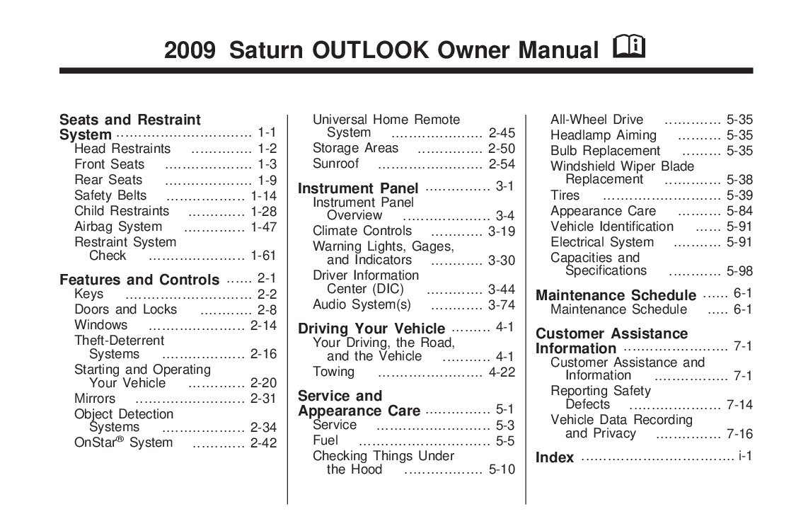 The 2009 SATURN Outlook owner’s manual contains information on the operation and location of controls, a maintenance schedule and