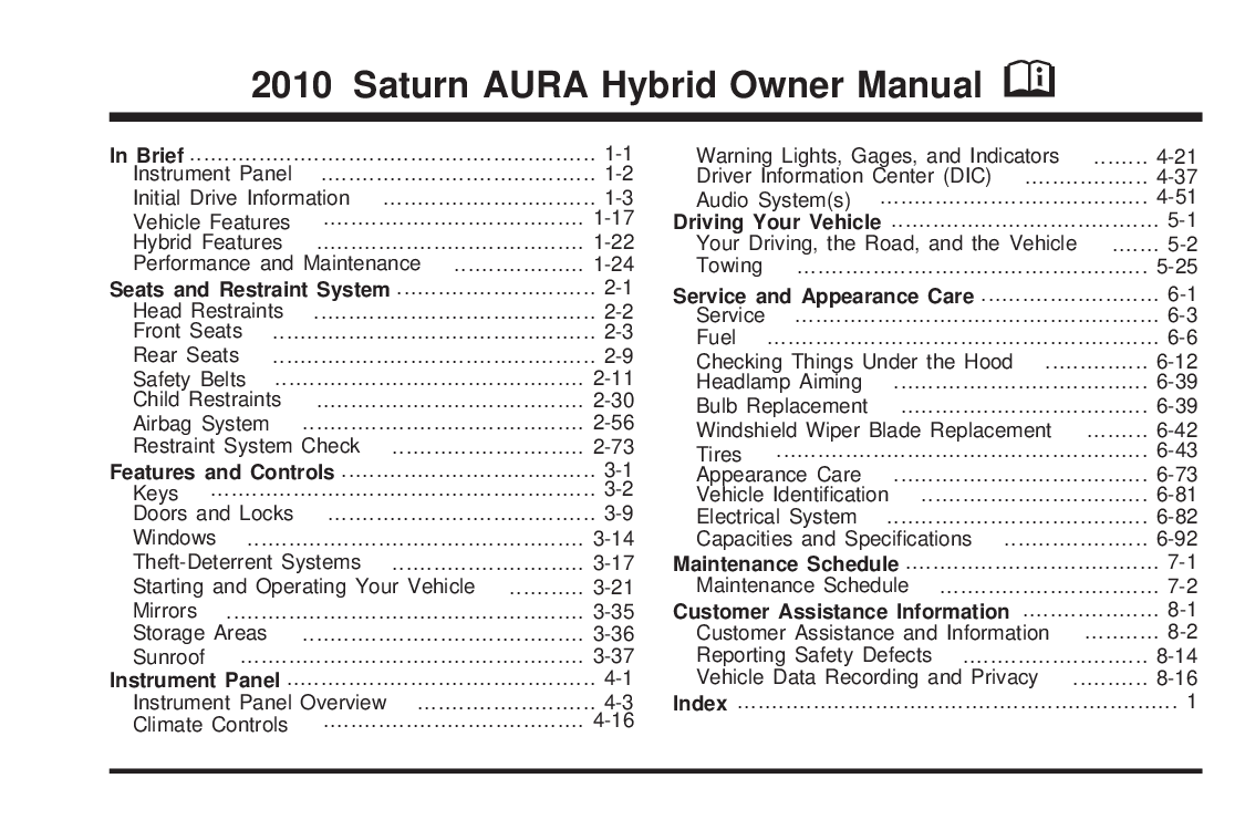 The 2010 SATURN Aura Hybrid owner’s manual contains information on the operation and location of controls, a maintenance schedule