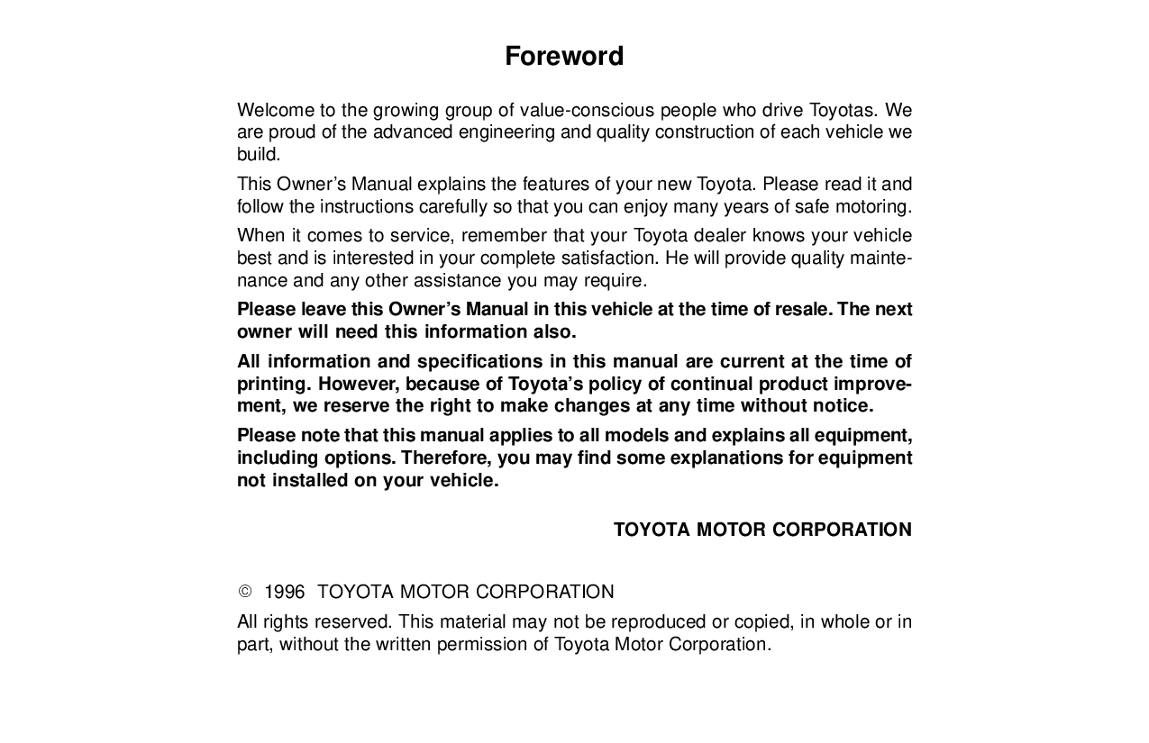 The 1996 TOYOTA Corolla Information Before Driving Your owner’s manual contains information on the operation and location of